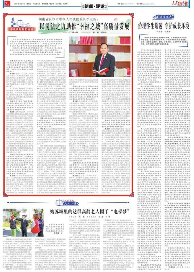 记者:经济社会高质量发展需要各方协同合作,长沙法院在加强与其他部门协同联动,形成服务保障经济社会高质量发展合力方面有哪些举措和经验?李立新:实现高质量发展是一项系统工程,涉及各方面各领域各环节,需要在党的全面领导下,充分调动和协调各方力量。长沙法院充分发挥定分止争、维护公正、促推治理等职能作用,不断画好“同心圆”、扩大“朋友圈”。比如,在知识产权保护上,与湘西、衡阳、湘潭、株洲四地中院共同签订合作备忘录,打造省域司法合作的样板。与长沙经开区管委会共同推进法庭信息化建设,促进创新链、产业链、司法链“三链融合”。在破产审判上,坚持以案件办理为契机,推动府院联动制度化建设。2024年,我们通过办理某仪表厂清算案,与相关部门联动,不仅解决了长达28年的遗留问题,还与市资规局联合出台了涉破产企业不动产事务办理规范意见。目前,我们已与市场监管、税务、人社、资规、住建等部门联合出台了5项涉破产企业的规范意见。在民主法治建设上,为人大立法和政府制定规章制度提供法律意见建议200余条。认真接受专项评议,主动邀请人大代表、政协委员来院视察调研和监督法院工作。在社会综合治理上,坚持“抓前端、治未病”,辖区6个基层法院入驻综治中心,协同建立协商、调解、仲裁、诉讼分层递进的矛盾纠纷多元化解机制。经过引导,今年当事人选择在综治中心解决纠纷5429件,调解成功1626件,等等。通过这些协同联动举措,形成了全社会共同参与和推动经济社会高质量发展的良好局面。