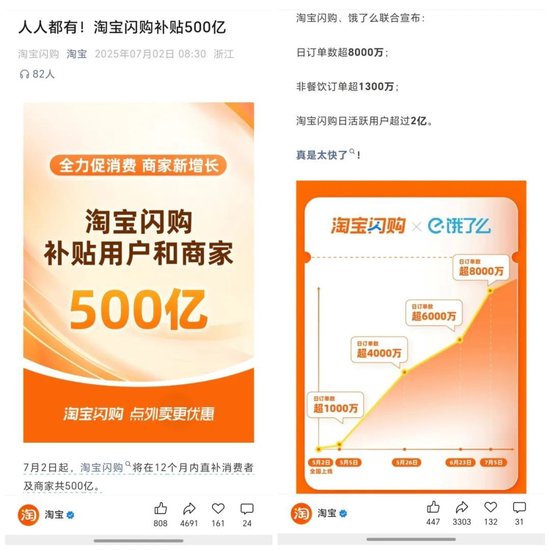 淘宝在周末的一波优惠券堪比惊世骇俗,12个月500亿的补贴,让淘宝成功在老对手京东面前赚回了一波牌面:优惠券发布后,淘宝闪购餐饮连锁品牌和中小商家的订单量分别环比增长170%和140%。